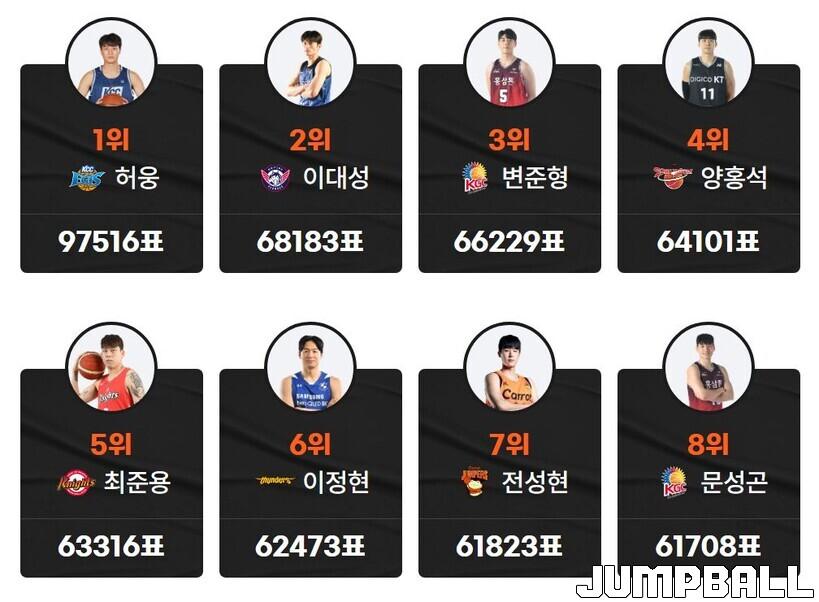 8일 오전 10시 기준으로 허웅이 97,516표를 얻어 단독 1위를 질주하고 있으며, 68,183표의 이대성이 2위, 66,229표의 변준형이 3위다.