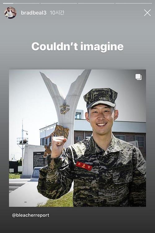 워싱턴 위저즈 브래들리 빌의 SNS 게시물이 국내 NBA 팬들 사이에서 화제다. 빌은 지난 9일(이하 한국 시간) 자신의 인스타그램 스토리에 손흥민의 훈련소 퇴소 사진을 게재하며 "상상할 수 없다(Couldn't imagine)"라는 문구를 남겼다.
