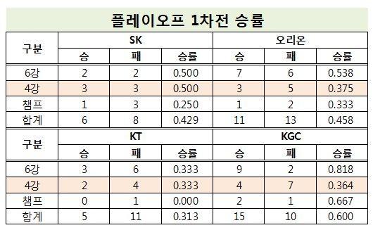 오리온과 KT도 4강 플레이오프 1차전 승률은 각각 37.5%(3승 5패)와 33.3%(2승 4패)로 KGC인삼공사와 비슷하지만, SK는 50.0%(3승 3패)로 넷 중에서 가장 낫다.
