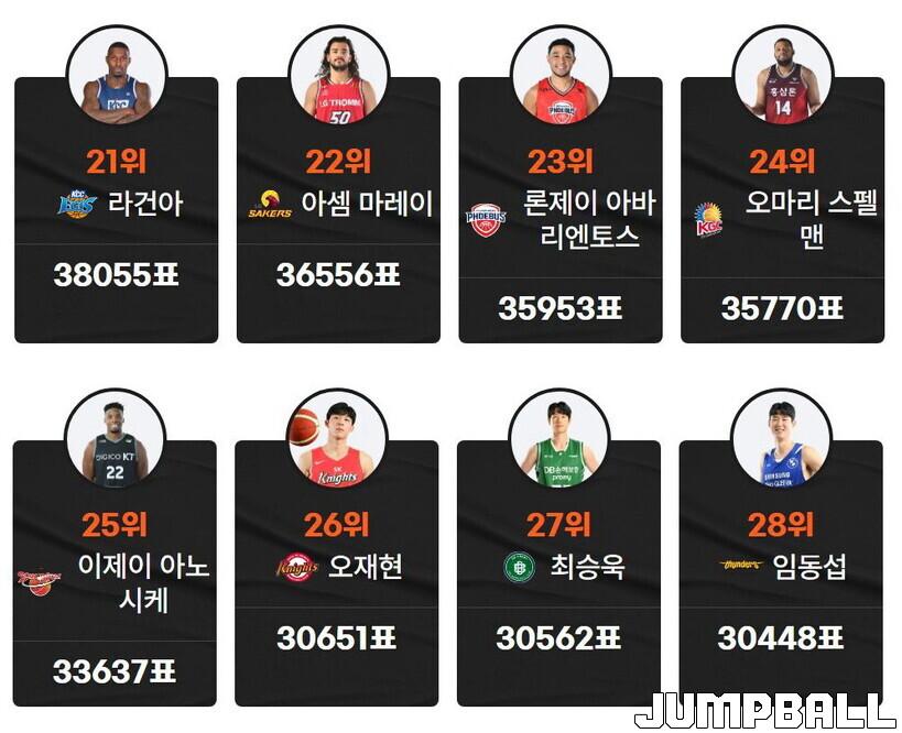 | ▲ KBL 올스타 팬 투표 21위부터 28위까지 득표 현황(KBL 홈페이지 캡처) |