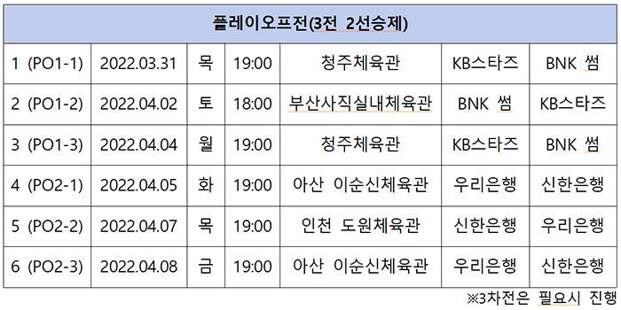 한편, KB스타즈와 BNK의 플레이오프 경기는 일정 변동없이 31일 청주에서 열리는 1차전을 시작으로 3전 2선승제로 진행된다. 챔피언결정전은 4월 10일부터 5전 3선승제로 열릴 예정이다.