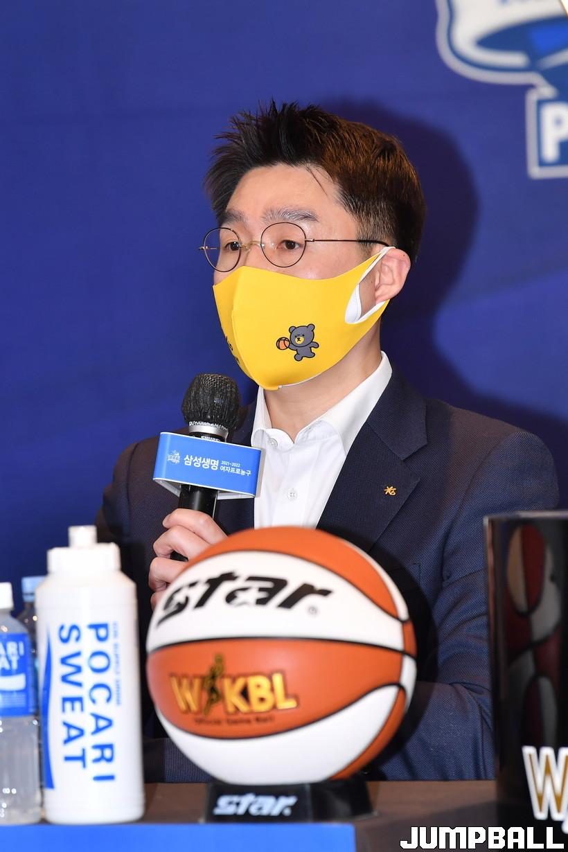 28일 서울 여의도 63컨벤션센터 4층 라벤더&로즈마리홀에서 열린 '삼성생명 2021-2022 여자프로농구 플레이오프 미디어데이', KB 김완수 감독이 출사표를 전하고 있다.