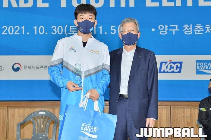 송도중 방성인이 중등부 캠프 MVP로 선정되어 KBL 김희옥 총재에게 시상 받고 있다.