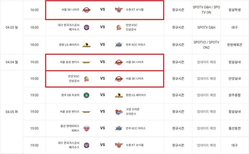 4월 2일이었다면, SK는 4월 3일 수원 KT전까지 주말 백투백을 소화한 데 이어 하루 휴식 후 4월 5일 안양 KGC를 만나는 일정이었다. 하지만 삼성전이 4월 4일에 편성돼 4월 3일부터 3일 연속 경기를 치르는 강행군을 맞이하게 됐다. 2002-2003시즌 원주 TG(현 DB)가 5일 동안 4경기를 치른 적은 있지만, 3일 연속 경기는 KBL 최초의 사례다.
