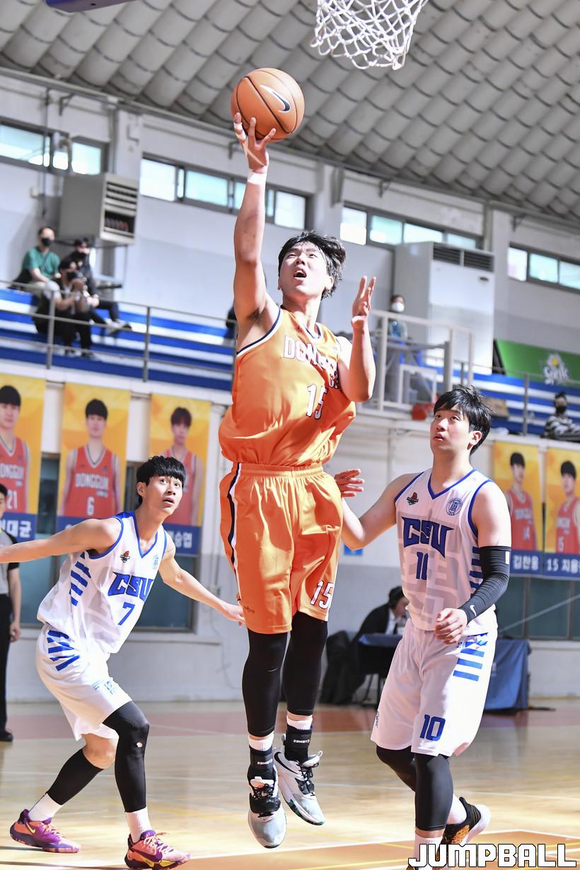 27일 서울 동국대 실내체육관에서 열린 2022 KUSF 대학농구 U-리그 동국대와 조선대의 경기, 동국대 지용현이 레이업을 올려넣고 있다.