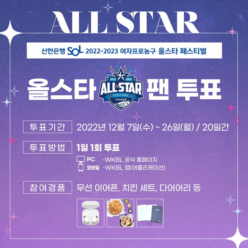WKBL(한국여자농구연맹)은 7일(수)부터 26일(월)까지 20일간 WKBL 공식 홈페이지(www.wkbl.or.kr)와 애플리케이션(앱)을 통해 ‘신한은행 SOL 2022-2023 여자프로농구 올스타 페스티벌’ 팬 투표를 실시한다.