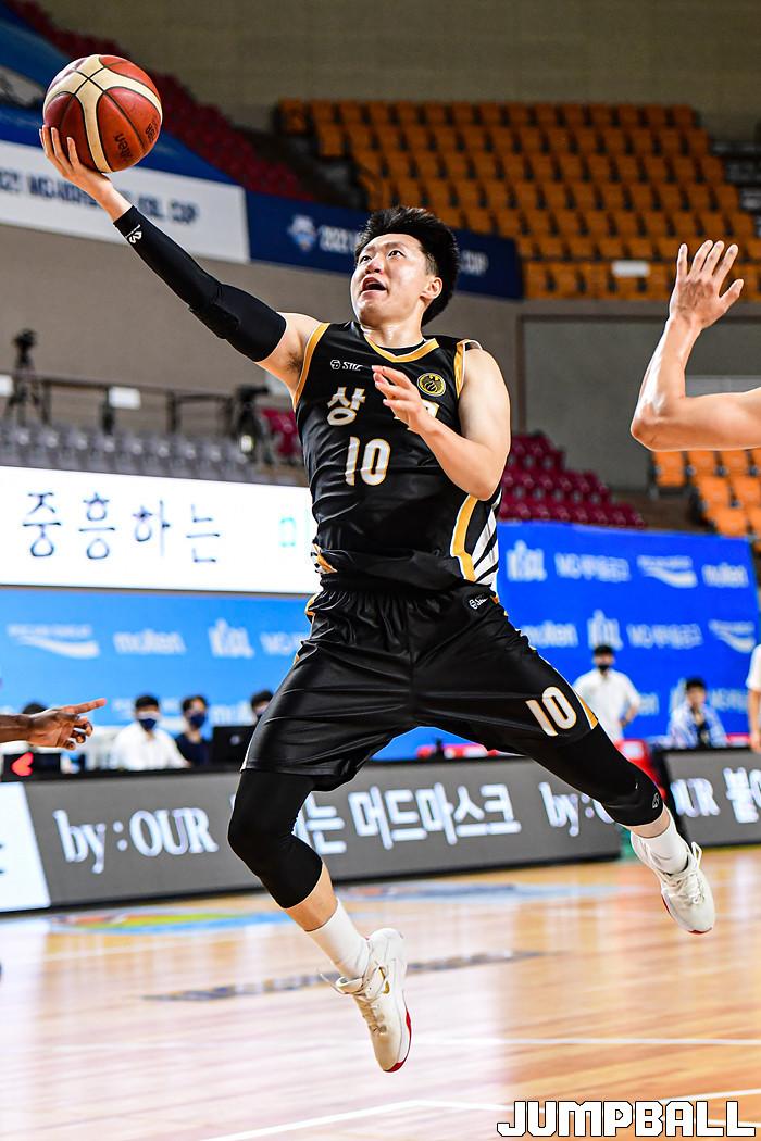 13일 경상북도 상주시 상주실내체육관에서 열린 2021 MG새마을금고 KBL컵 대회 원주 DB와 상무의 경기, 상무 최성모가 레이업슛을 시도하고 있다.