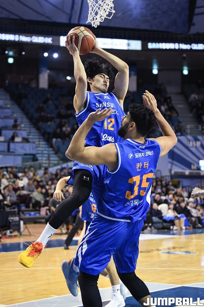 [점프볼=잠실/유용우 기자] 4일 잠실실내체육관에서 열린 2025-2026 LG전자 프로농구 서울 삼성과 원주 DB의 경기, 삼성 임동언이 수비 리바운드를 잡고 있다.