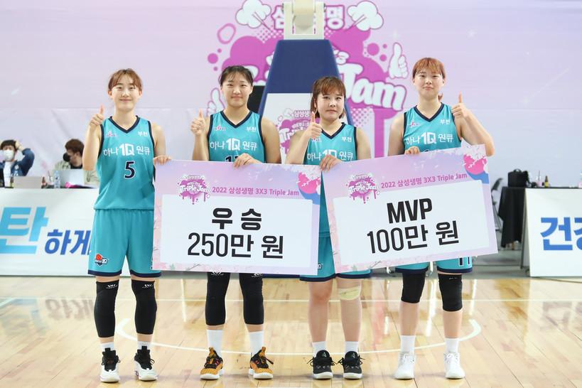 부천 하나원큐는 23일 서울 장충체육관에서 열린 2022 삼성생명 3x3 트리플잼 1차 대회에서 우승을 차지했다. 3승 1패로 용인 삼성생명(3승 1패)과 동률을 이뤘지만 승자 승 원칙에서 앞서며 정상에 올랐다. 하나원큐에게는 우승 상금 250만원이 수여됐다.