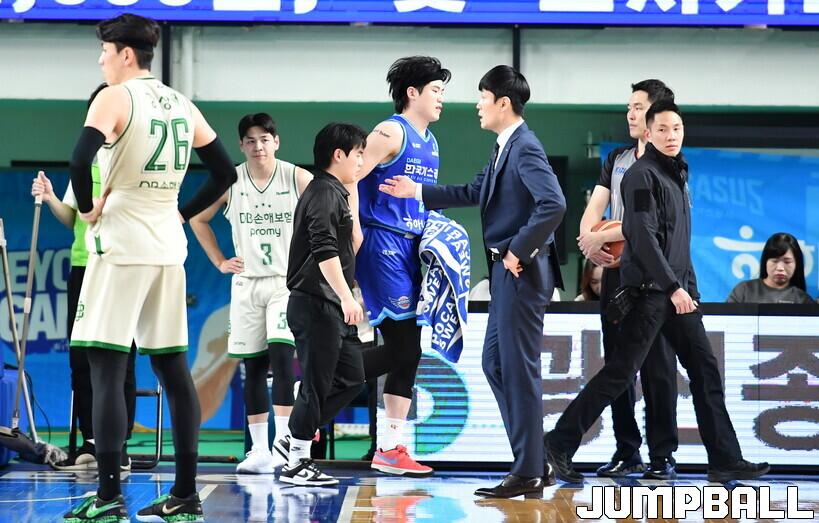 4쿼터 9분 17초를 남기곤 신승민이 속공 과정에서 DB 선수의 발을 밟았다. 신승민은 그나마 트레이너의 부축을 받으면서 교체되었다.