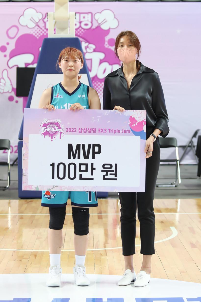 부천 하나원큐 김하나는 23일 장충체육관에서 열린 2022 삼성생명 3x3 트리플잼 1차 대회에서 MVP를 차지했다. 김하나는 4경기에서 도합 19점을 쓸어 담으며 하나원큐의 우승을 이끌었다.