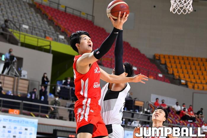 17일 경상북도 상주시 상주실내체육관에서 열린 2021 MG새마을금고 KBL컵 대회 수원 KT와 서울 SK의 4강 경기, SK 안영준이 더블 클러치로 득점에 성공하고 있다.