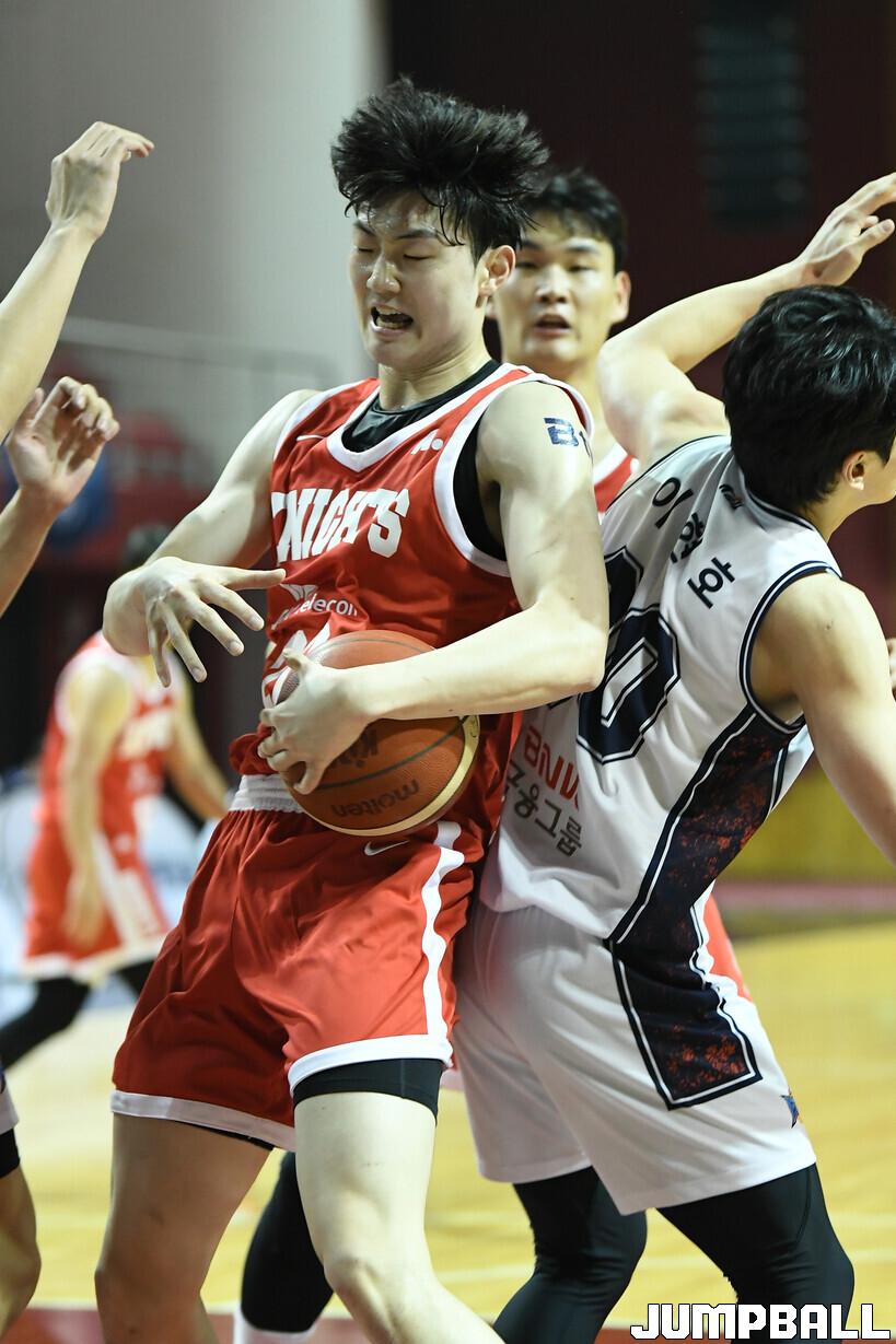 [점프볼=용인/유용우 기자] 24일 경희대 선승관 체육관에서 열린 2025-2026 KBL D리그 서울 SK와 부산 KCC의 경기, SK 김명진이 리바운드를 경합하고 있다.