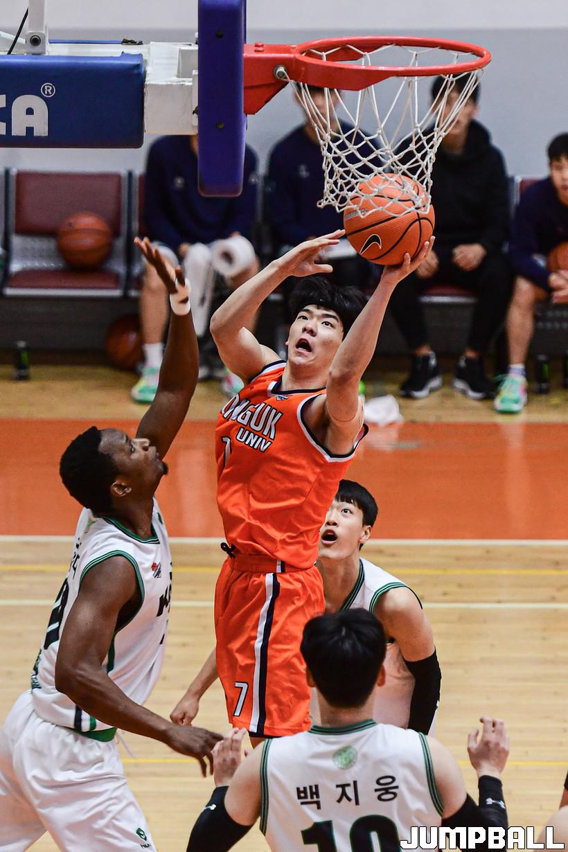13일 동국대학교 체육관에서 열린 2022 KUSF 대학농구 U-리그 동국대와 건국대의 경기, 동국대 이승훈이 골밑에서 공격을 시도하고 있다.