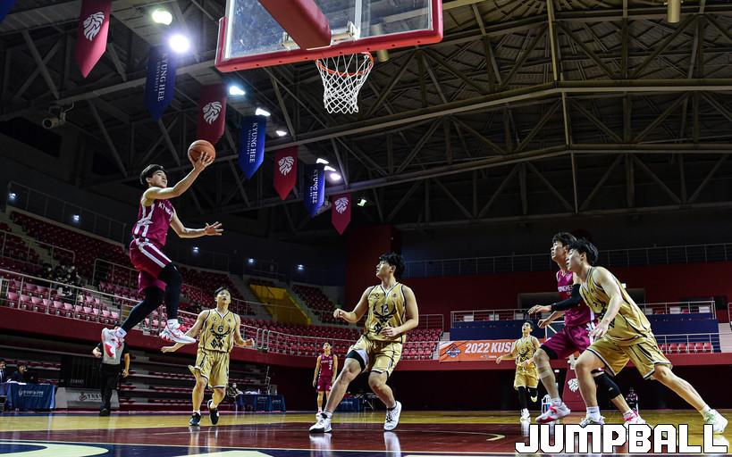 14일 경희대학교 체육관에서 열린 2022 KUSF 대학농구 U-리그 경희대와 상명대의 경기, 경희대 고찬혁이 레이업슛을 시도하고 있다.