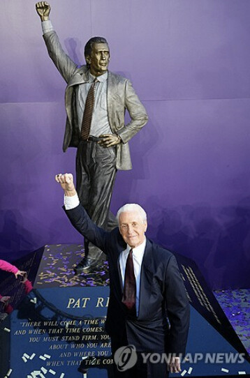 LA LIVE 광장을 바라보는 정문은 코비, 샤크, 매직, 웨스트 등 수많은 레이커스 레전드의 동상이 지키고 있는데, 수호신이 하나 더 추가된 날이었다. 주인공은 바로 1980년대 ‘쇼타임 레이커스’의 수장 팻 라일리. 라일리의 스타디움 동상 헌액식을 위해 레이커스 역전의 용사들이 결집하였다.
