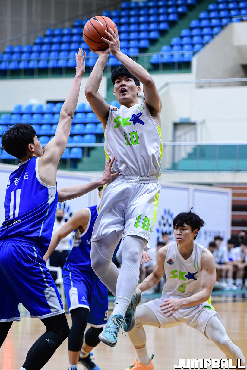 15일 명지대학교에서 열린 2022 KUSF 대학농구 U-리그 명지대와 성균관대의 경기, 성균관대 안정욱이 슛을 시도하고 있다.