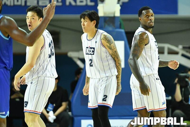 9일 군산월명체육관에서 열린 2023 MG새마을금고 KBL 컵대회 한국가스공사와 KCC의 예선 경기, KCC 이승현 최준용 라건아가 수비를 위해 백코트하고 있다.[점프볼=군산/유용우 기자]