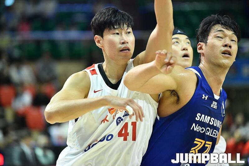 8일 군산월명체육관에서 열린 2023 MG새마을금고 KBL 컵대회 SK와 삼성의 예선 경기, SK 오세근이 SK 유니폼을 입고 첫 공식경기에 나섰다.[점프볼=군산/유용우 기자]
