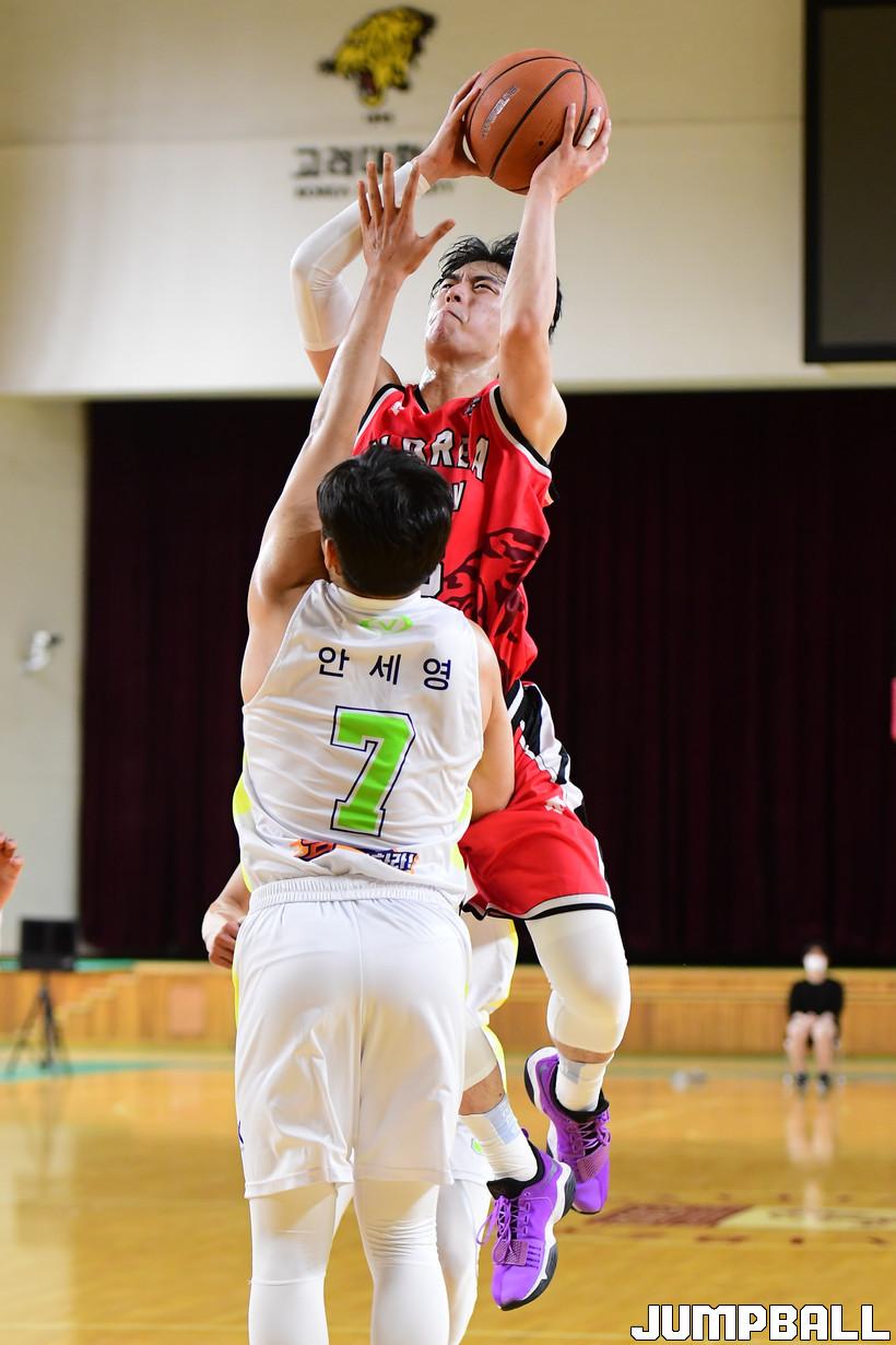 10일 고려대 화정체육관에서 열린 2022 KUSF 대학농구 U리그 고려대와 성균관대의 경기, 고려대 박무빈이 골밑에서 슛을 시도하고 있다.
