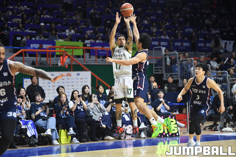 1쿼터 2분 47초까지 3점슛 7개를 집중시켰다. 이 사이 DB가 넣은 2점슛은 박인웅의 속공 단 하나였다.
