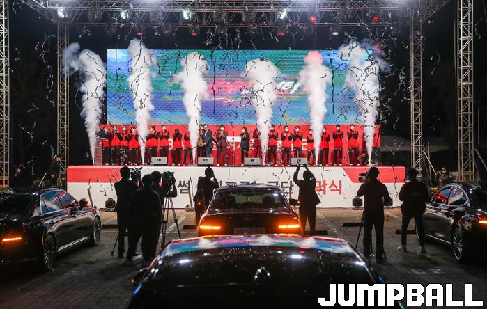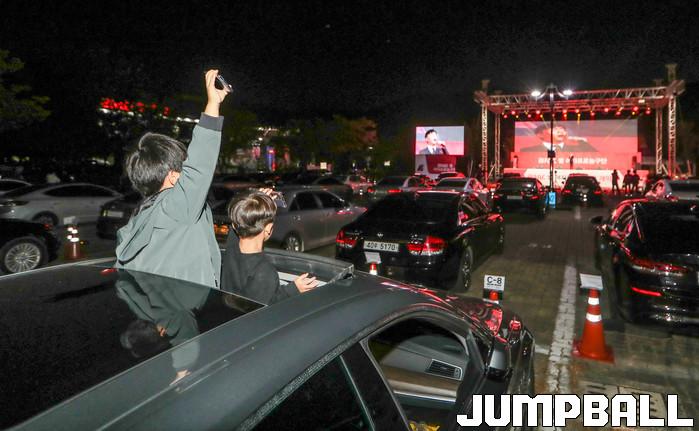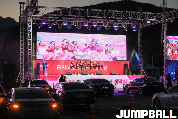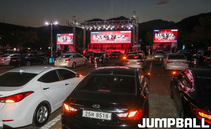 14일 스포원파크 BNK센터에서 부산 BNK와 청주 KB스타즈의 홈 경기에 앞서 코로나19의 재확산으로 인한 사회적 거리두기 지침에 따라 직관할 수 없는 팬의 아쉬움을 달래기 위해 자동차 극장에서 착안한 언택트 개막식이 열리고 있다. 사전 온라인 접수를 통해 등록된 126대의 차량이 부산 스포원파크 BNK센터 앞 야외 주차장에 입장하면 지정된 야외무대에서 선수 소개 및 개막 선언이 진행되며 행사가 끝나면 차량에 탑승한 인원은 편안하게 대형 LED 전광판을 통해 경기를 관전할 수 있다.