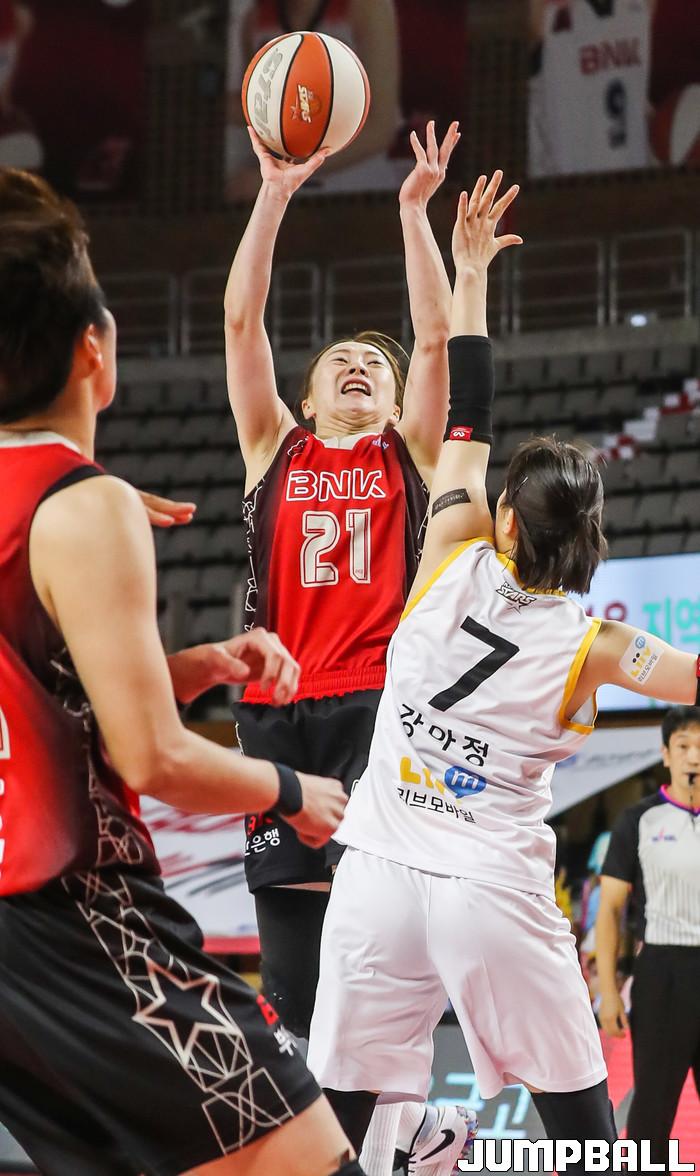 14일 스포원파크 BNK센터에서 열린 부산 BNK와 청주 KB스타즈의 홈 경기에서 BNK 김진영이 KB 강아정의 수비를 피해 슛을 하고 있다.