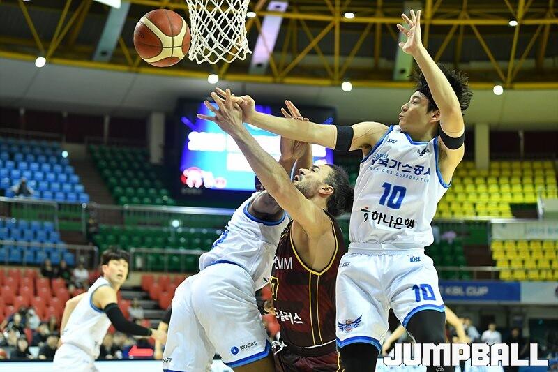 11일 군산월명체육관에서 열린 2023 MG새마을금고 KBL 컵대회 한국가스공사와 LG의 예선 경기, 한국가스공사 염유성이 LG 마레이의 공격을 저지하고 있다. [점프볼=군산/유용우 기자]