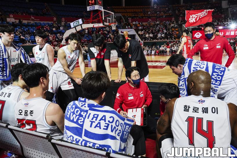 강을준 감독은 이어 “전반에 우리 페이스가 왔을 때 조금 더 냉정하게 임했으면 이런 스코어가 나오지 않았을 거란 아쉬움이 남는다. 이승현이 없었지만 이정제는 열심히 해줬다. 역할을 잘 수행해줬다. 가드들이 조금 더 냉정하게 경기를 한다면 재밌는 경기를 할 수 있을 것이다. 비디오미팅 통해 강약조절을 해야 할 것 같다”라고 덧붙였다.