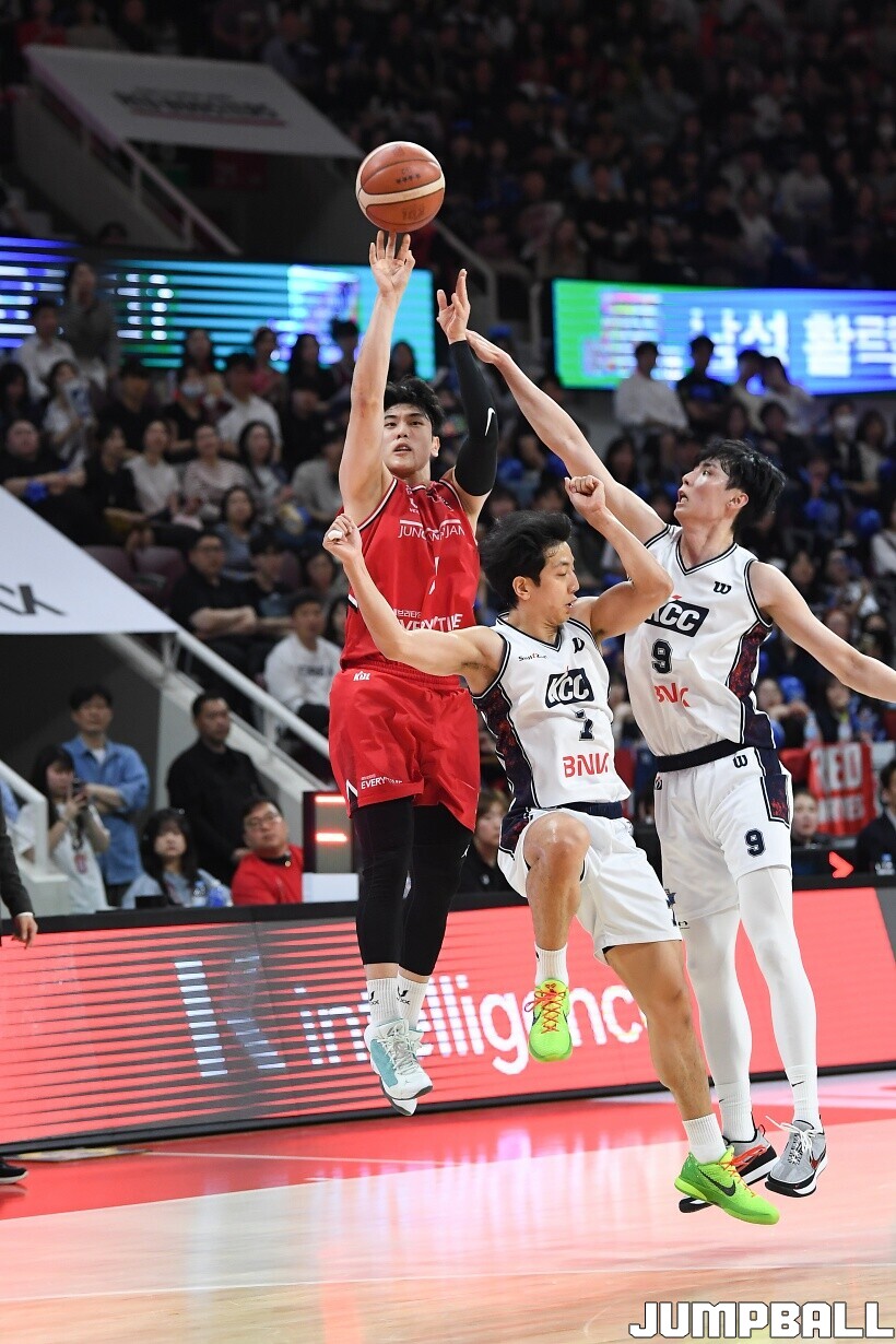 [점프볼=안양/유용우 기자] 24일 안양 정관장 아레나에서 열린 2025~2026 LG전자 프로농구 4강 플레이오프 1차전 안양 정관장과 부산 KCC의 경기, 정관장 변준형이 공격을 시도하고 있다.