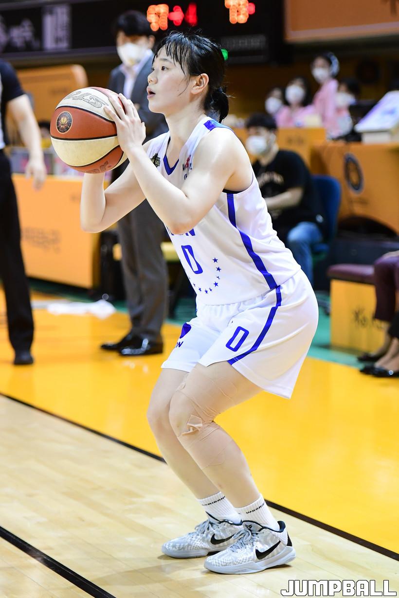 12일 청주실내체육관에서 열린 '삼성생명 2021-2022 여자프로농구 챔피언결정전 2차전' 청주 KB스와 아산 우리은행의 경기, 우리은행 김진희가 3점슛을 시도하고 있다.