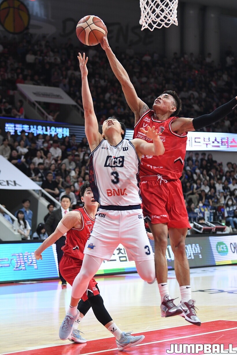 [점프볼=안양/유용우 기자] 24일 안양 정관장 아레나에서 열린 2025~2026 LG전자 프로농구 4강 플레이오프 1차전 안양 정관장과 부산 KCC의 경기, 정관장 렌즈 아반도가 블록으로 KCC 허웅의 공격을 저지하고 있다.