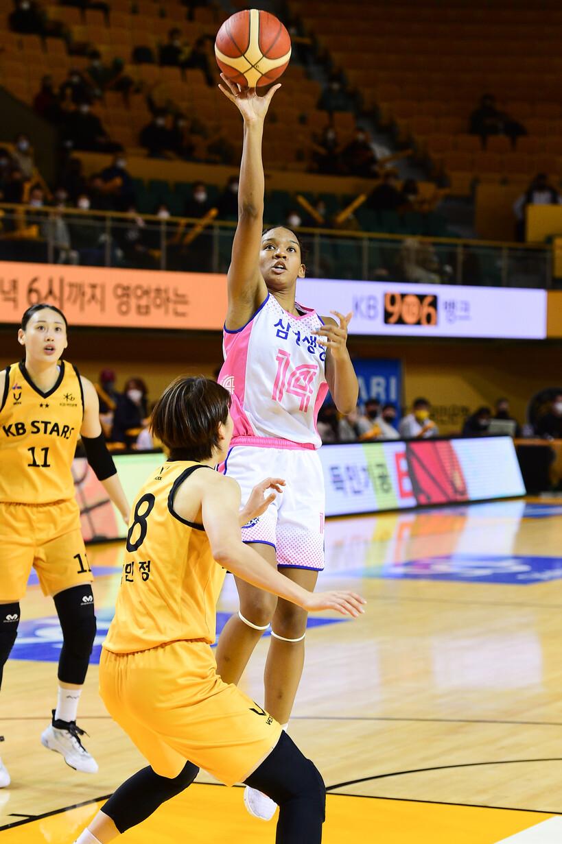 용인 삼성생명 키아나 스미스는 9일 청주체육관에서 열린 신한은행 SOL 2022~2023 여자프로농구 청주 KB스타즈와의 3라운드 맞대결에서 18점 3리바운드 5어시스트로 맹활약했다. 키아나와 더불어 배혜윤(21점 11리바운드 4어시스트)이 더블더블을 작성한 삼성생명은 66-54로 승리를 챙겼다.