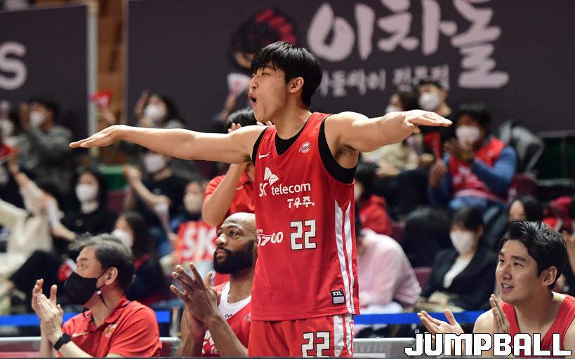 4일 잠실실내체육관에서 열린 2021-2022 KGC인삼공사 정관장 프로농구 서울 삼성과 서울 SK의 S-더비 6차전 경기, SK 오재현이 환호하고 있다.