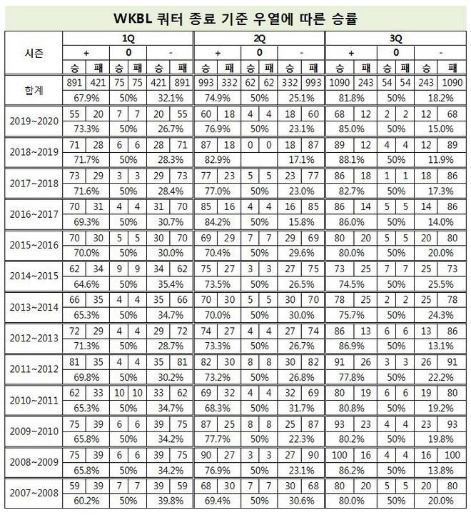 [점프볼=이재범 기자] 하나원큐 2019~2020 여자프로농구가 신종 코로나 바이러스 감염증 영향으로 8경기를 남겨놓고 시즌을 종료했다. WKBL은 최종순위를 시즌 종료 시점을 기준으로 반영하며, 플레이오프를 치르지 않는다고 결정했다. 모든 경기를 마무리하지 못하고 아쉽게 끝난 이번 시즌을 기록으로 되돌아보자. 세 번째로 쿼터 종료 기준 득점 우위로 승률을 살펴본다. 여기서 언급하는 기록들은 모두 2007~2008시즌 이후 단일리그 기준이며, WKBL에서 공식기록으로 인정하지 않는 2015~2016시즌 KEB하나은행의 기록까지 포함한다.