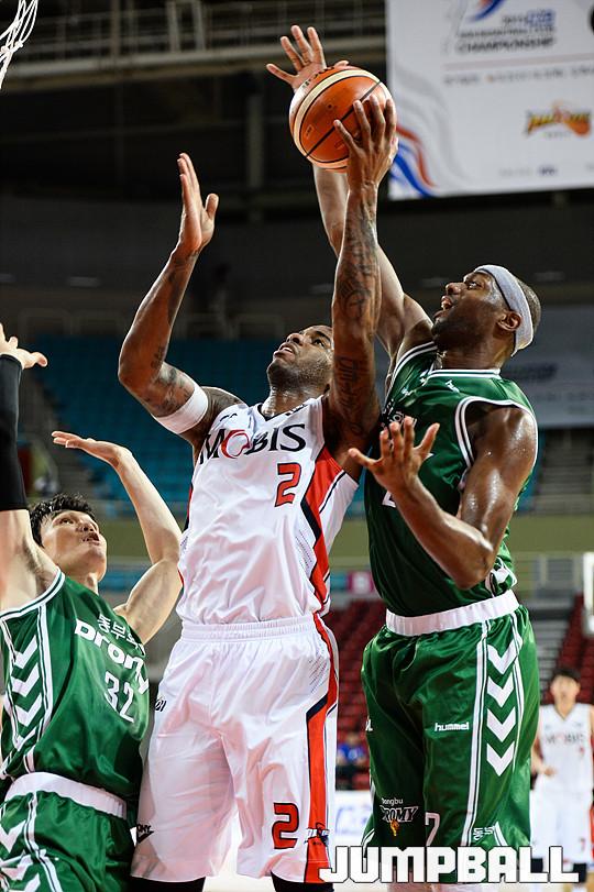 모비스는 벤슨에 대한 수비가 되지 않았다. 라이온스가 대부분 일대일로 막았으나, 제어하기가 힘들었다. 벤슨(206.7cm)이 라이온스(205.4cm)보다 1.3cm가량이 더 컸고, 골밑에서 더 능숙했다.