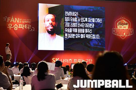 파티의 첫 시작은 우승 다큐 영상 시청이었다. 30여분 동안 상영된 우승 다큐 영상은 비시즌부터 챔피언결정전 우승 때까지의 모든 장면들이 담겨 있었다. 이어 미국에서 재활 중인 애런 헤인즈가 “안녕하세요!! 팀이 우승할 수 있도록 최선을 다하신 코칭스태프 선수단 여러분과 우승을 위해 응원을 해주신 팬 여러분 모두 축하드립니다”라고 메시지를 보내와 뜻 깊은 시간을 보냈다.
