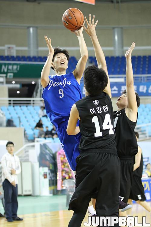 전반은 전주고의 37-29 리드였다. 전주고는 협력 수비와 트랜지션 게임으로 득점을 올렸고, 경기 막판 높이에서 약간 앞서며 경기 주도권을 잡았다. 박진오(185cm, G)가 9점으로 팀 공격을 주도했고, 신동혁(195cm, F)도 8점으로 뒤를 받쳤다.
