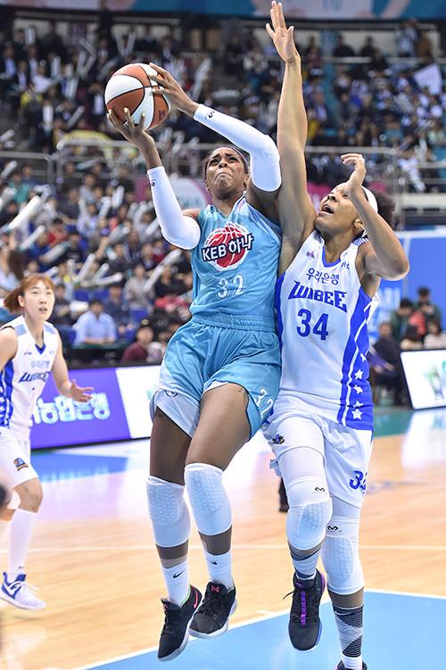 [점프볼=부천/강현지 기자] KEB하나은행 카렌 미첼이 1순위 외국선수 샤이엔 파커(26, 192cm)가 날개를 달 수 있게 조력자가 되고 있다.