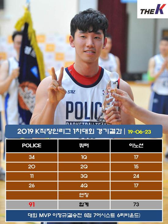 POLICE는 23일 서울 관악고등학교 체육관에서 열린 STIZ배 2019 The K직장인농구리그(www.kbasket.kr) 1차대회 디비전 1 결승전에서 3점슛 16개를 합작하는 등 73점을 합작한 심혁보(31점 7어시스트 5리바운드, 3점슛 8개), 김남태(21점 13리바운드 3어시스트 3블록슛, 3+1점슛 4개), 양정목(21점 6리바운드 3스틸, 3점슛 4개) 활약에 힘입어 이노션 추격을 91-73으로 따돌리고 The K직장인농구리그 10회 우승이라는 대기록을 작성하였다.