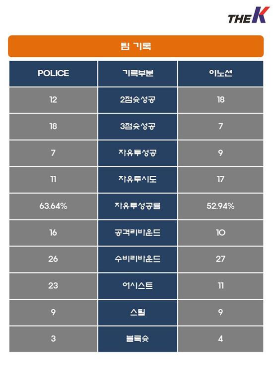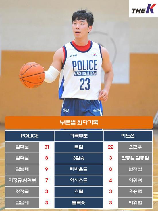 POLICE는 주전센터 조충식이 타 대회에서 당한 코 부상과 당직으로 인하여 모습을 드러내지 않았다. 여기에 임승현이 헴스트링 부상을 당하여 코트에 나서지 못하는 악재를 맞았다. 양정목도 허리가 좋지 않은 상황. 이에 강성욱, 심혁보에 The K직장인농구리그 역사상 최고의 선수로 자리매김하였던 김남태까지 나서 후배들을 도왔다. 심혁보는 개인 최다인 3점슛 8개를 꽃아넣어 물오른 감각을 뽐냈다. 양정목을 비롯한 이정규, 권태복, 김규호, 이승엽, 이제동도 형들 뒷받침에 힘을 얻어 제 기량을 마음껏 발휘하였다.
