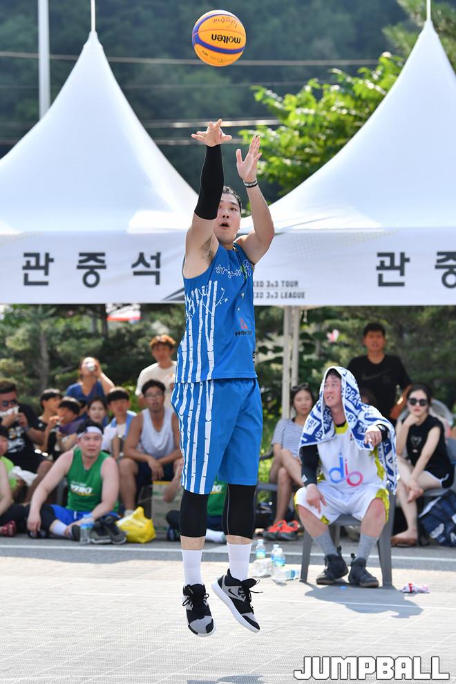 [점프볼=평창/홍기웅 기자] 4일 평창 대화면 평창더위사냥축제 특설코트에서 열린 '2019 KXO 4라운드 평창' 리그 결승 하늘내린인제와 DSB의 경기. 하늘내린인제 김민섭이 외곽슛을 던지고 있다.